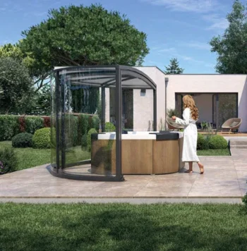 Abri panoramique pour spa extérieur avec structure aluminium durable et parois transparentes, protection contre intempéries et option d’ouverture totale ou partielle.