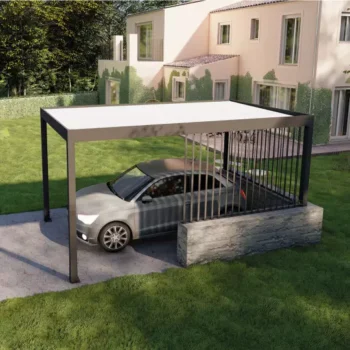 Carport autoporté en aluminium thermolaqué, livré en kit, avec toiture résistante et drainage intégré pour protéger voiture, moto ou matériel extérieur contre soleil, pluie et intempéries.