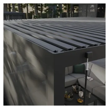 Pergola élégante en aluminium avec lamelles de toit orientables offrant ombrage modulable, confort hors saison et design contemporain pour terrasse ou jardin.