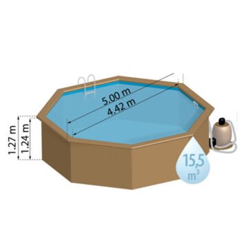 Piscine hors‑sol ronde en bois massif d’environ Ø 5,00 m × 1,27 m de hauteur, livrée en kit complet avec système de filtration à sable 6 m³/h, liner PVC bleu épais, feutres de protection pour fond et parois, skimmer, buse de refoulement, échelle intérieure inox, échelle extérieure bois, caches‑angles inox et accessoires de montage. Installation flexible hors‑sol, semi‑enterrée ou enterrée.