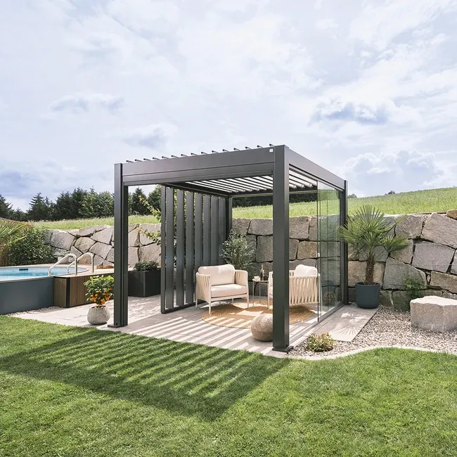 Pergola élégante en aluminium avec lamelles de toit orientables offrant ombrage modulable, confort hors saison et design contemporain pour terrasse ou jardin.
