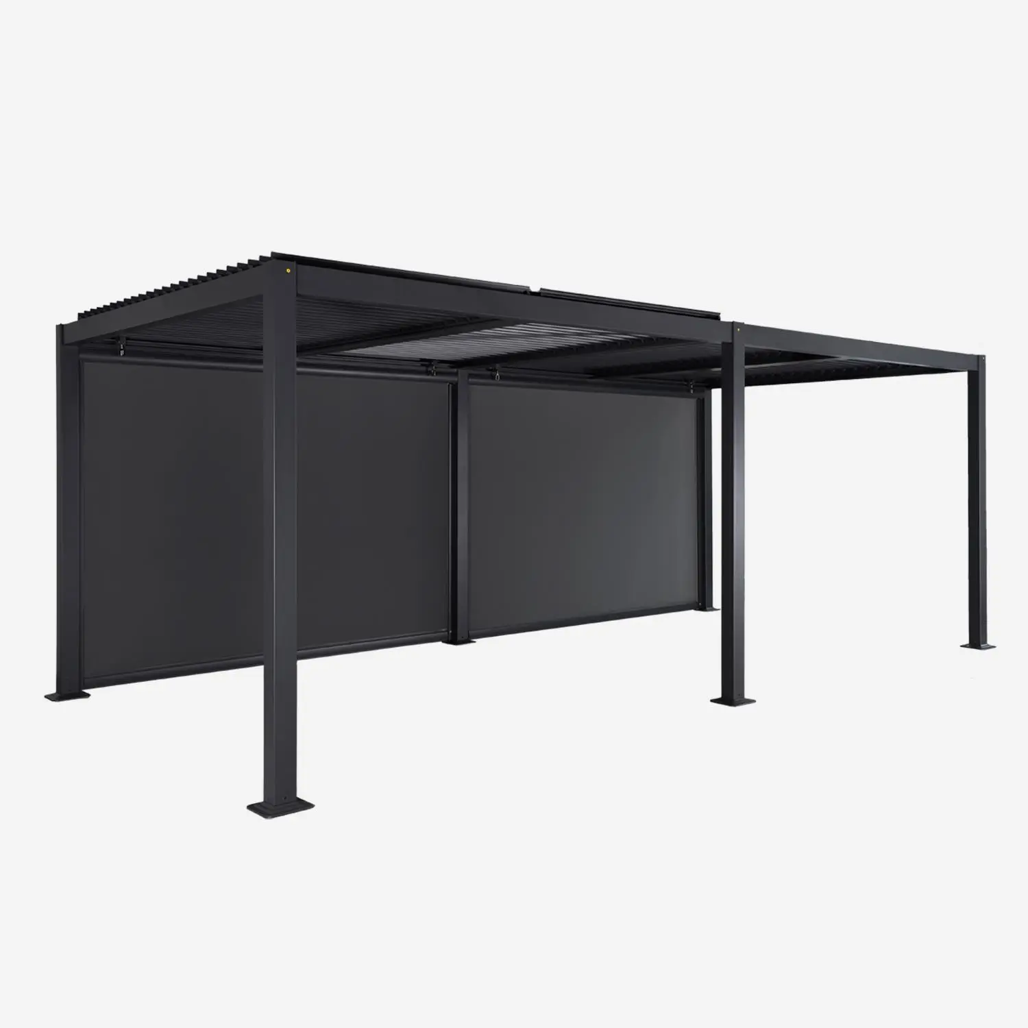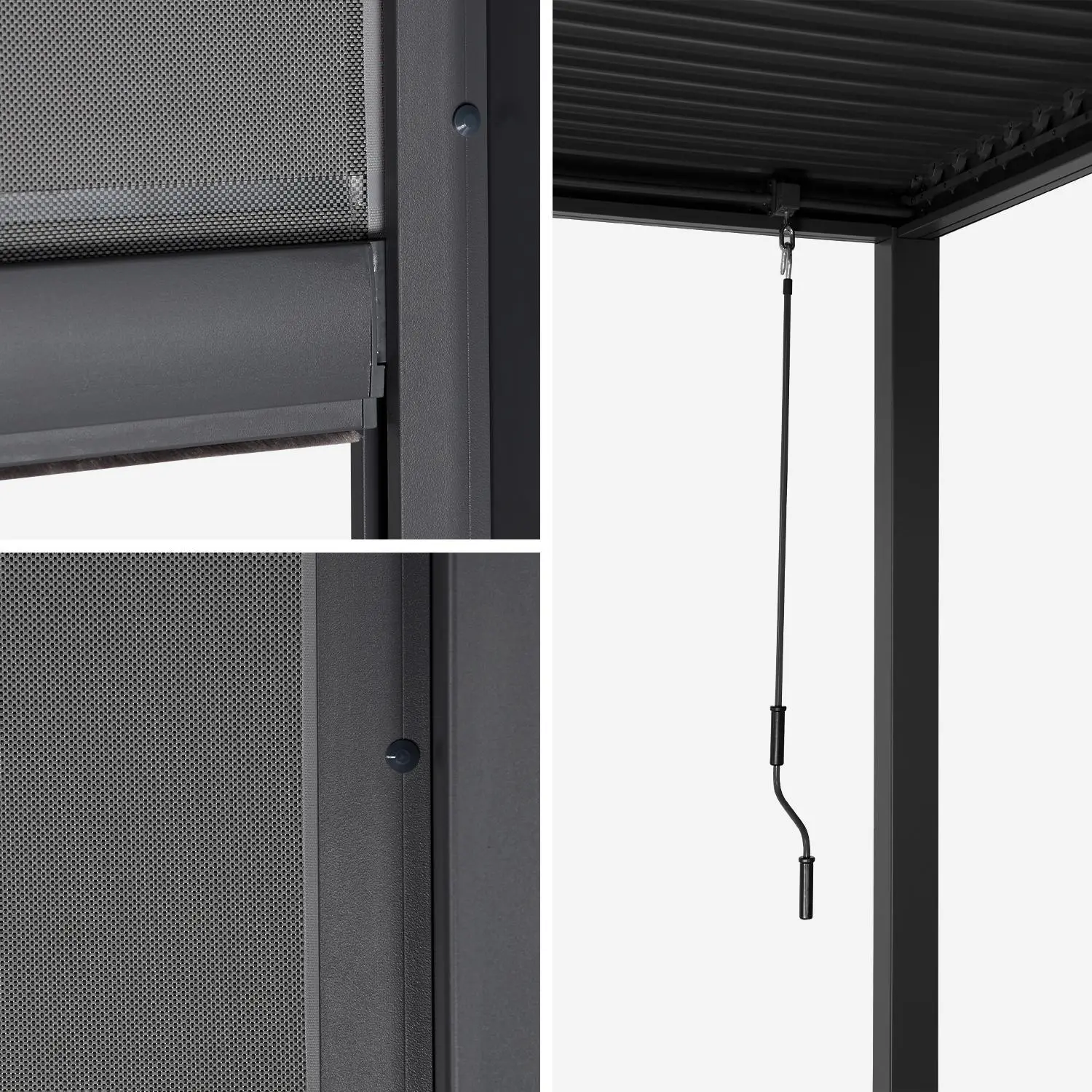 Ce modèle inclut deux stores latéraux en textilène résistant aux UV et aux intempéries, qui s’abaissent manuellement pour améliorer l’intimité, réduire l’éblouissement ou constituer une barrière contre le vent ou les pluies légères lors de vos moments de détente ou de repas en extérieur.