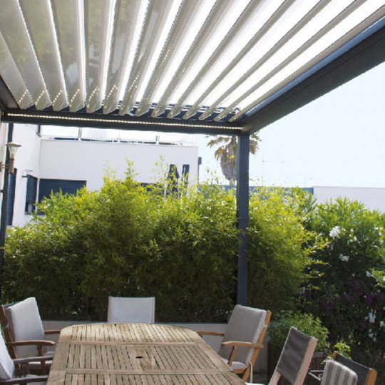 Le toit à lames orientables jusqu’à environ 115° vous permet de gérer facilement l’ensoleillement, l’ombre et la ventilation naturelle pour créer l’ambiance idéale selon la météo ou vos envies. La motorisation intégrée à double vérin facilite l’ajustement des lames pour une manipulation fluide et personnalisée.