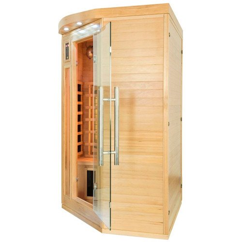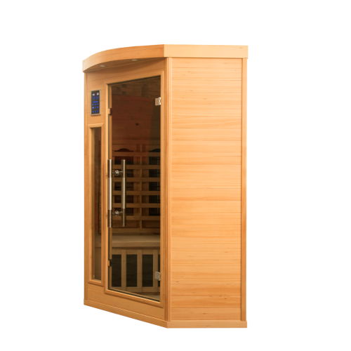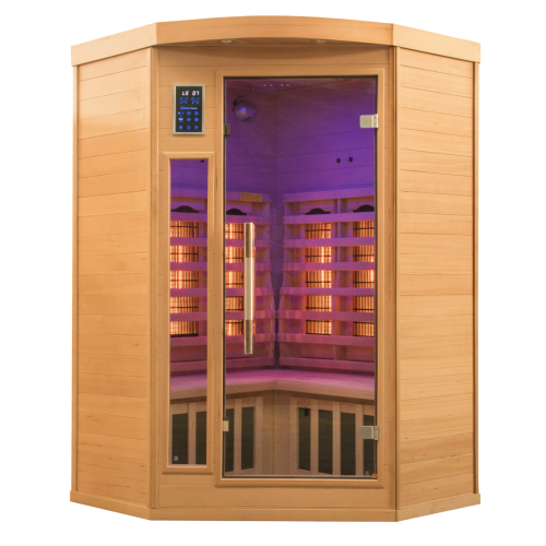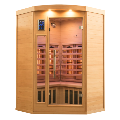 Sauna infrarouge intérieur pour 2 personnes, doté d’une cabine en bois massif Western Hemlock, émetteurs infrarouges à spectre complet combinés à des panneaux carbone pour une chaleur homogène, éclairage LED chromothérapie et système audio Bluetooth/FM/MP3 pour une expérience bien‑être immersive.