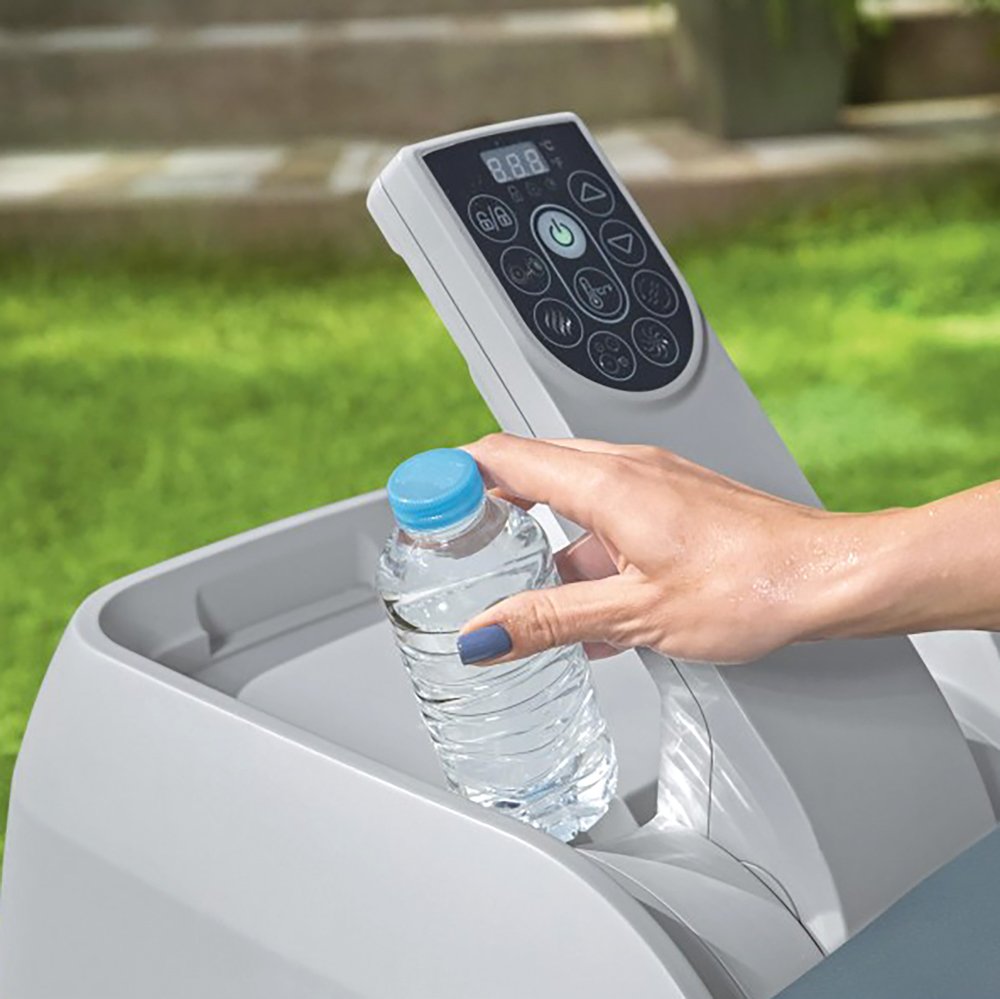 Spa gonflable pour 4 personnes avec 140 diffuseurs de bulles relaxantes, système de stérilisation au sel, contrôle Wi‑Fi via application mobile, chauffage jusqu’à 40 °C, filtration complète et accessoires inclus pour profiter d’un espace détente chez soi.